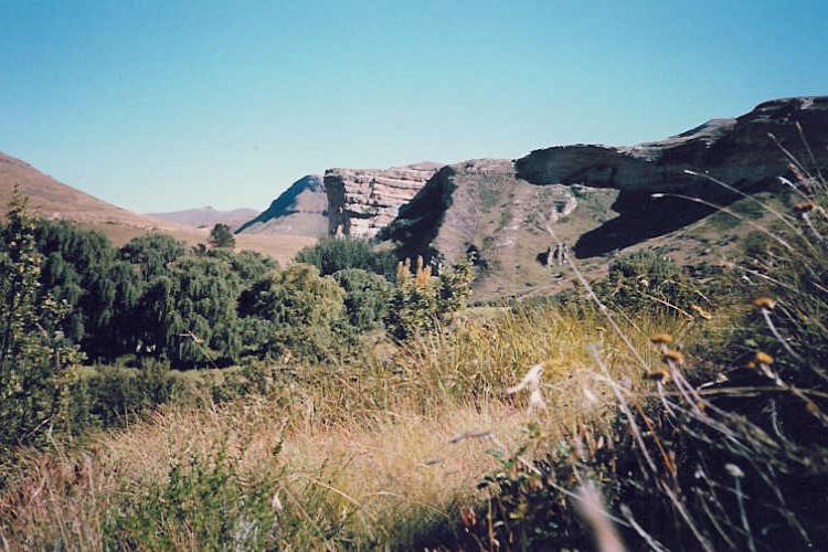 die im Südosten von den Sandsteinfelsen der Drakensberge